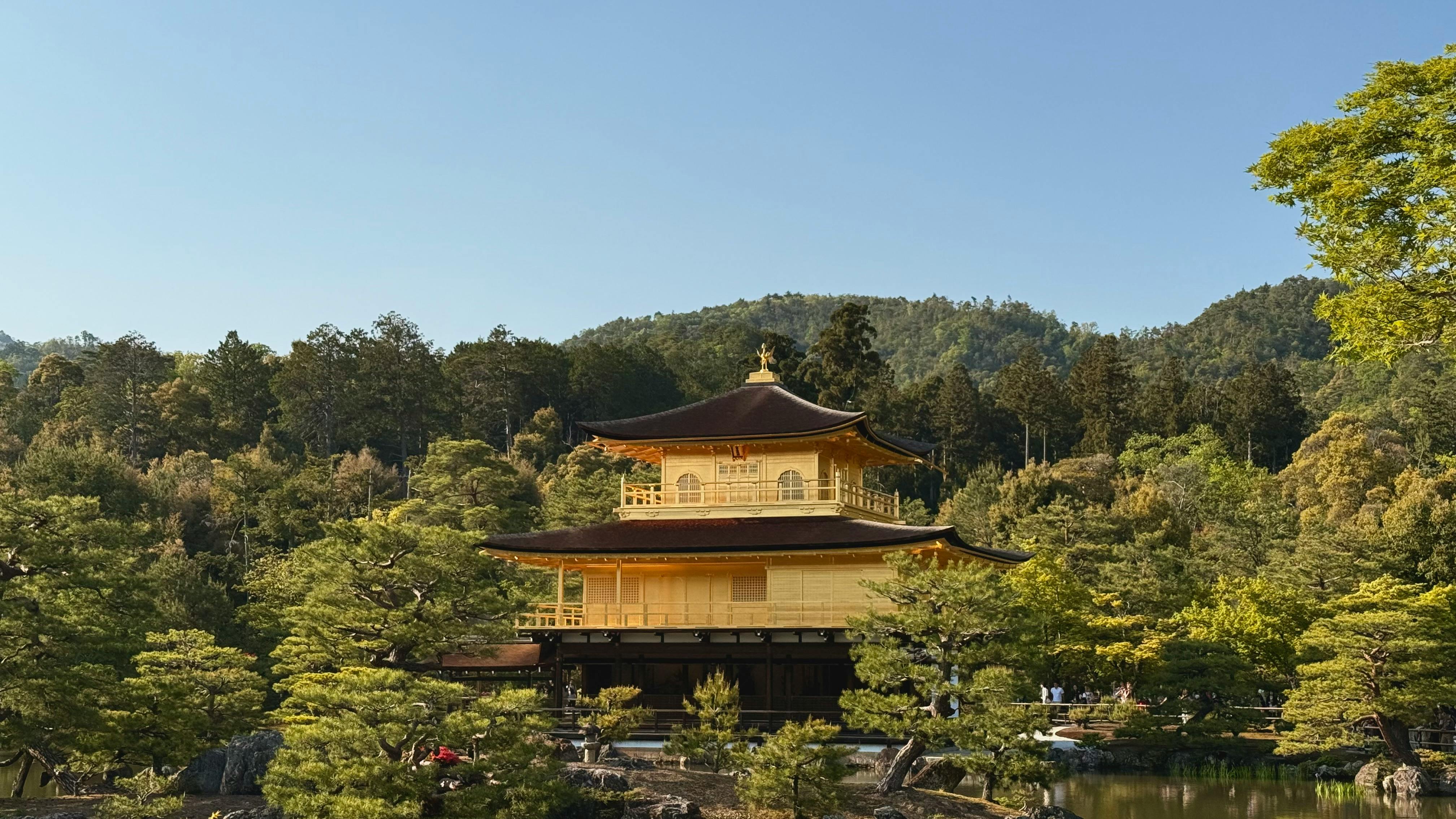 O grande destaque do Kinkaku-ji é o seu pavilhão principal, cuja parte superior é totalmente revestida com folhas de ouro. Essa característica faz com que o templo brilhe intensamente quando iluminado pela luz do sol. O reflexo dourado no lago cria uma paisagem considerada uma das mais belas de todo o Japão.